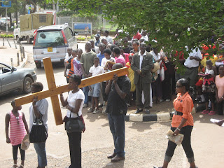 So, this awesome day began with a trip to downtown Kampala to change money and to visit the local market. I wasn't there at the time but I hear that Melanie sampled some ants and a grasshopper at the market (photo coming soon) and that the ants were tastier. By the time I caught up with the group, Alexis told me "Cecilia, you brought the right people - they are fearless!" YES!! This news made me very happy as you can well imagine and it set the tone for the rest of the day. Today was Good Friday and so there were several processions throughout the city. One went right by us as we were sitting in the cafe of the Speke hotel. We were completely captivated by the sight of the people carrying the cross and of the hundreds of people walking along and behind the cross - it was really special and we were so lucky that we had a chance to experience Good Friday Africa-style! The rest of the day was no less amazing - just driving along the road is fascinating. Particularly mesmerizing are the boda-bodas, the Ugandan motorcycle taxis which can carry a shocking number of people at one time. We also visited the local Anglican cathedral as well as the gorgeous Serena Hotel this afternoon. However, the most impactful part of our day was our visit to the Sanyu Babies home - and that blog entry is coming soon!